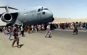 Hundreds of people run alongside a U.S. Air Force C-17 transport plane as it moves down a runway of the international airport, in Kabul, Afghanistan, Monday, Aug.16. 2021. Thousands of Afghans have rushed onto the tarmac at the airport, some so desperate to escape the Taliban capture of their country that they held onto the American military jet as it took off and plunged to death. (Verified UGC via AP) August 16, 2021