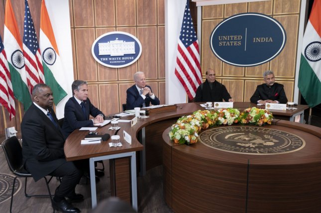 “Our continued consultation and dialogue are key to ensuring the U.S.-India relationship continues to grow deeper and stronger,” Biden added.Biden speaks at Monday’s meeting with Secretary of State Antony Blinken. Defense Secretary Lloyd Austin also participated in the virtual conference at the White House. Photo by Chris Kleponis/UPI