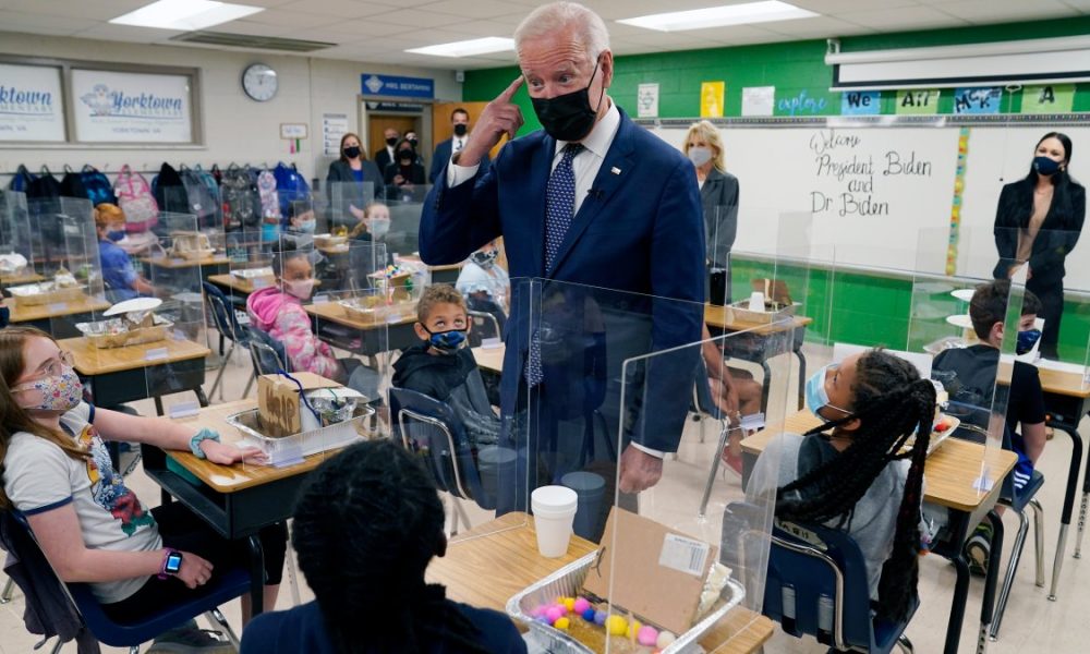 President Joe Biden talks to students at Brookland Middle School in Washington, as first lady Jill Biden talks with Brookland Middle School science teacher Michelle Taylor, right rear. As Democrats push ahead with Biden’s $3.5 trillion rebuilding plan, they are promising historic investments across all levels of education. The proposal includes universal prekindergarten, two years of free community college and expanded child care subsidies, among others.