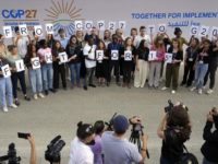 Youth climate activists hold signs that read “from COP27 to G20 fight for 1.5” at the COP27 U.N. Climate...
