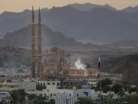 Workers walk past signage promoting this year’s United Nations global summit on climate change, known as COP27, adorns Peace...