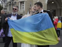 Newly wed Ukrainians hold a Ukrainian flag as people gather in downtown to celebrate the recapturing of Kherson city,...