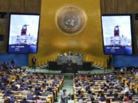 An image of the ‘Brave Commander’ ship carrying grain from Ukraine is displayed on screens as Secretary-General António Guterres...