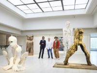 In this photo provided by Sara Hilden Art Museum, British artist Thomas Houseago, centre, poses with US actor Brad...