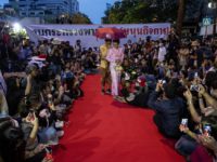 Pro-democracy protesters perform on a mock “red carpet” fashion show billed as a sort of counterpoint to a fashion...
