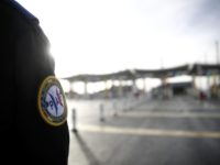 A member of the French Customs Police is seen near the British border on the Eurotunnel site in Coquelles,...