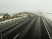 The snowplow is seen propelling a wave of ice, snow and slush into incoming traffic on the Ohio Turnpike...
