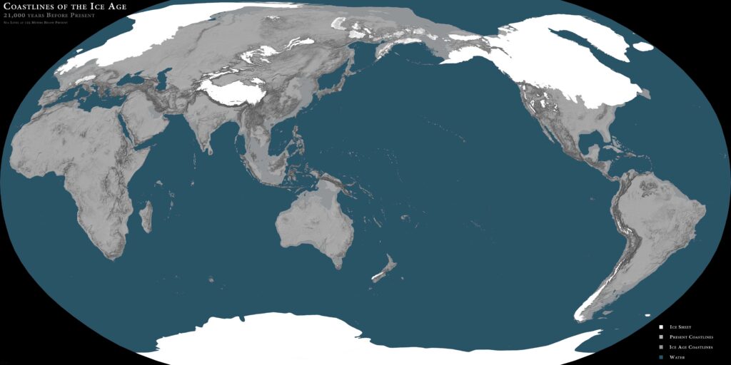 Los siguientes mapas y recreaciones, compartidos en Reddit, muestran como habría sido el mundo hacia el año 21.000. Por entonces, al haber más agua congelada, los niveles del mar eran de unos 125 metros por debajo de los de hoy en día.