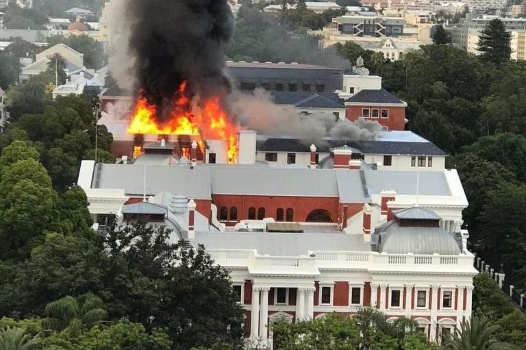 Un gran incendio causó daños significativos a los edificios en el complejo parlamentario de Sudáfrica en Ciudad del Cabo el domingo por la mañana. Foto cortesía del Parlamento de la República de Sudáfrica/Twitter