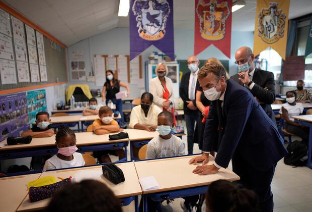 French President Emmanuel Macron, center, flanked with French Education, Youth and Sports Minister Jean-Michel Blanquer, right, speaks with children during a visit at Bouge primary school in Malpasse district of Marseille, southern France, Thursday Sept. 2, 2021 as twelve million children in France went back to school Thursday for the new academic year, wearing face masks as part of rules aimed at slowing down the spreading of the virus in the country. French President Emmanuel Macron, accompanied by several ministers, is on a three-day visit to the southern city of Marseille to address security, education and housing issues. September 07, 2021