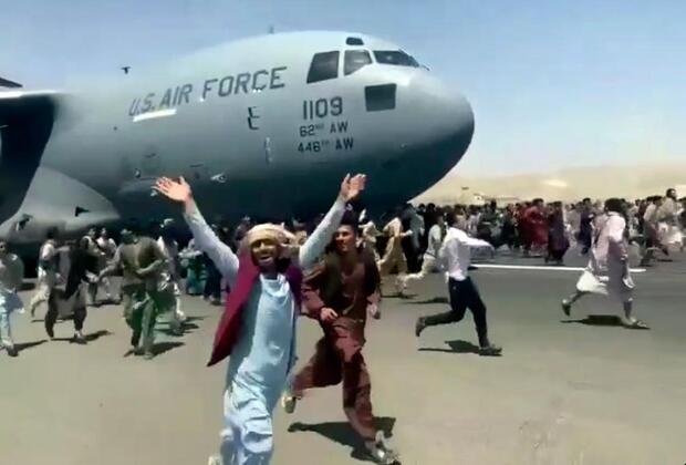 Hundreds of people run alongside a U.S. Air Force C-17 transport plane as it moves down a runway of the international airport, in Kabul, Afghanistan, Monday, Aug.16. 2021. Thousands of Afghans have rushed onto the tarmac of Kabul’s international airport, some so desperate to escape the Taliban capture of their country that they held onto an American military jet as it took off and plunged to death. (Verified UGC via AP) August 16, 2021