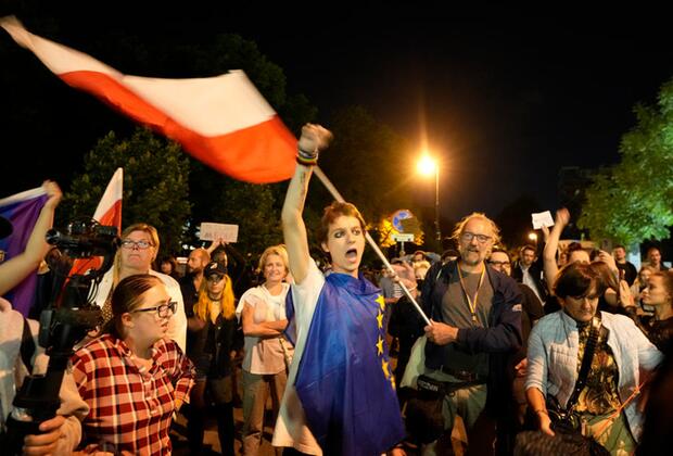 People protest outside the Polish parliament after lawmakers passed a bill seen as harmful to media freedom in Warsaw, Poland, Aug. 11, 2021. Poland’s parliament voted Wednesday in favor of a bill that would force Discovery Inc., the U.S. owner of Poland’s largest private television network, to sell its Polish holdings and is widely viewed as an attack on media independence in Poland. August 12, 2021