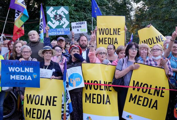 People demonstrate in defense of media freedom in Warsaw, Poland, on Tuesday, Aug. 10, 2021. Poland’s ruling right-wing party has lost its parliamentary majority after a coalition partner announced it was leaving the government, Wednesday Aug. 11, 2021, amid a rift over a bill which the junior partner party views as an attack on media freedom. August 11, 2021