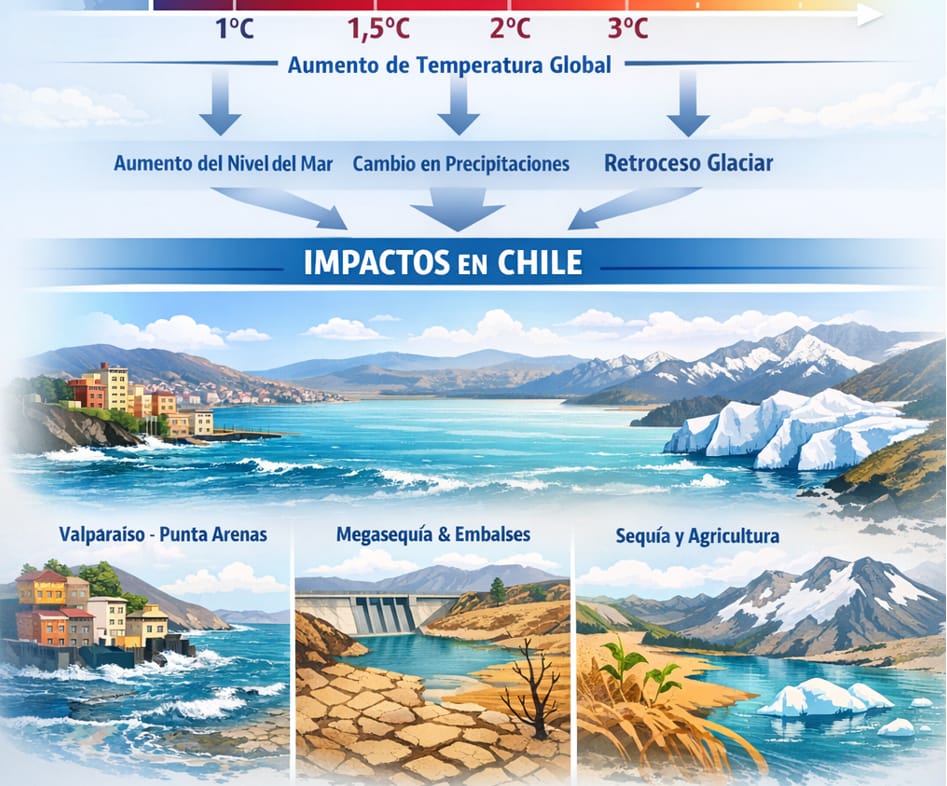 Para Chile, los puntos de inflexión climáticos se interceptan con vulnerabilidades estructurales del territorio. La eventual desestabilización de las capas de hielo de Groenlandia y la Antártica Occidental compromete aumentos del nivel del mar a largo plazo, afectando ciudades costeras como Valparaíso, Talcahuano, Puerto Montt y Punta Arenas. Incluso incrementos moderados intensifican marejadas, inundaciones y erosión, presionando infraestructura y ecosistemas marinos.
