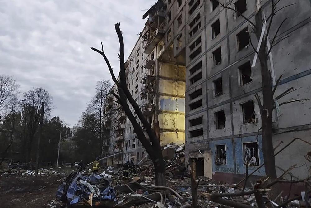 A firefighter looks at a part of a wall falling from the residential building that was heavily damaged after a Russian attack in Zaporizhzhia, Ukraine, Sunday, Oct. 9, 2022. (AP Photo/Leo Correa)