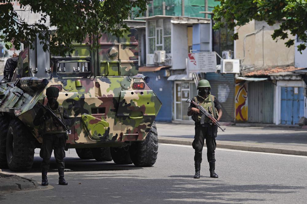 Armored trucks with soldiers riding on top rolled into some areas of Colombo. Defying the curfew, some protesters regrouped opposite the president’s office to continue demonstrations that began over a month ago. Police announced over loudspeakers that it is illegal to stay in public places during the curfew.