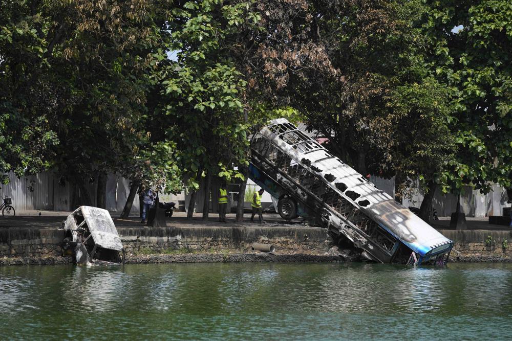 Sri Lankan police officers investigate in the aftermath of riots which broke out between government supporters and anti government protesters, in Colombo, Sri Lanka, Wednesday, May 11, 2022. Sri Lanka’s defense ministry ordered security forces on Tuesday to shoot anyone causing injury to people or property to contain widespread arson and mob violence targeting government supporters.