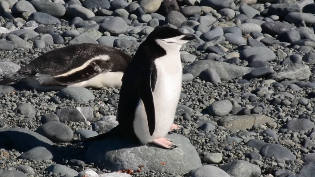 When a clumsy neighbor passes by or predatory seabirds are near, the penguin parent blinks to alert attention and soon dozes off again, its chin nodding against its chest, like a drowsy driver.