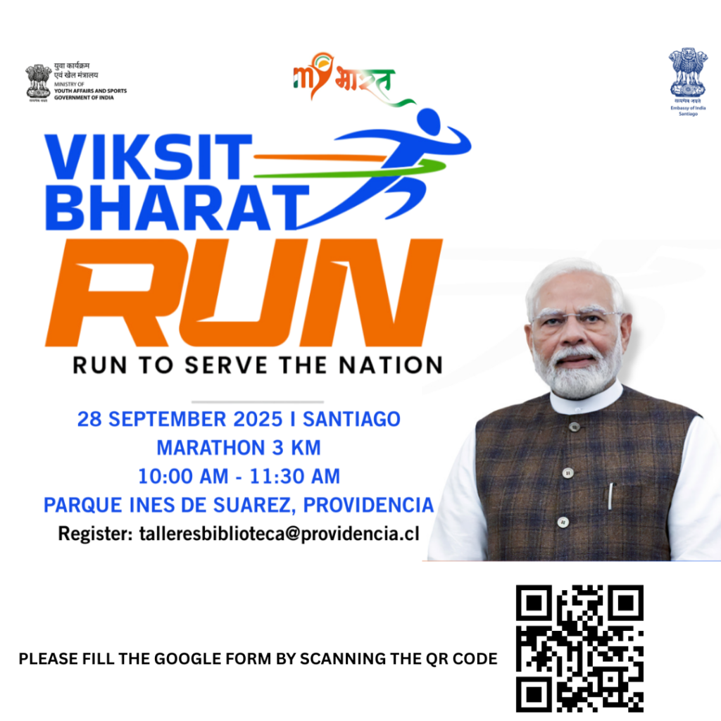 Nos complace informarles que la Embajada de la India en Chile, junto al Ministerio de Juventud y Deportes del Gobierno de la India y con el apoyo de la Ilustre Municipalidad de Providencia, llevará a cabo la “Viksit Bharat Marathon 2025 – Run to Serve the Nation” el próximo domingo 28 de septiembre de 2025, de 10:00 a 11:30 hrs. en el Parque Inés de Suárez, Providencia.